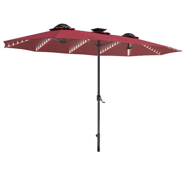 15 ft. Outdoor Large Double Market Patio Umbrella with Solar Lights, LED Lights and Crank Handle in Red