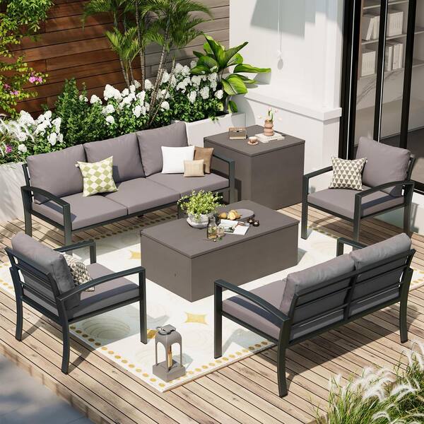 6-Piece Metal Patio Conversation Set w/ Dark Grey Cushions and Storage Boxes