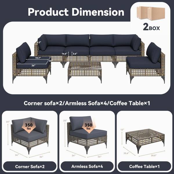 7-Piece Patio Outdoor Wicker Furniture Sofa Set with Tea Table, PE Rattan Sectional Conversation Set, Dark Grey Cushions