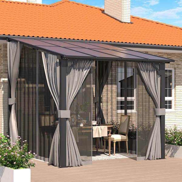 8 ft. x 8 ft. Outdoor Hard Top Gazebo for Patio, Small Wall-Mounted Lean to Pergola with Curtains and Netting