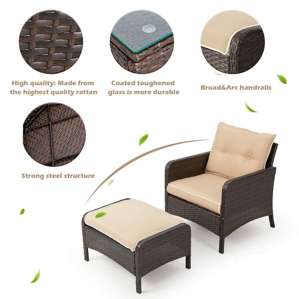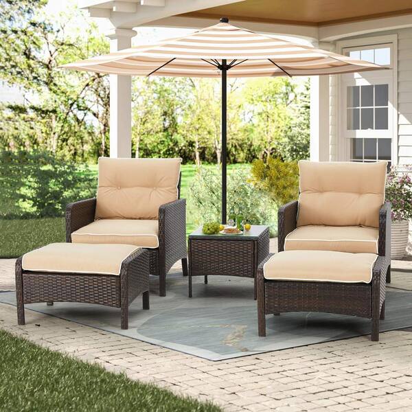 Brown 5-Piece Wicker Patio Conversation Set with Ottoman and Beige Cushions