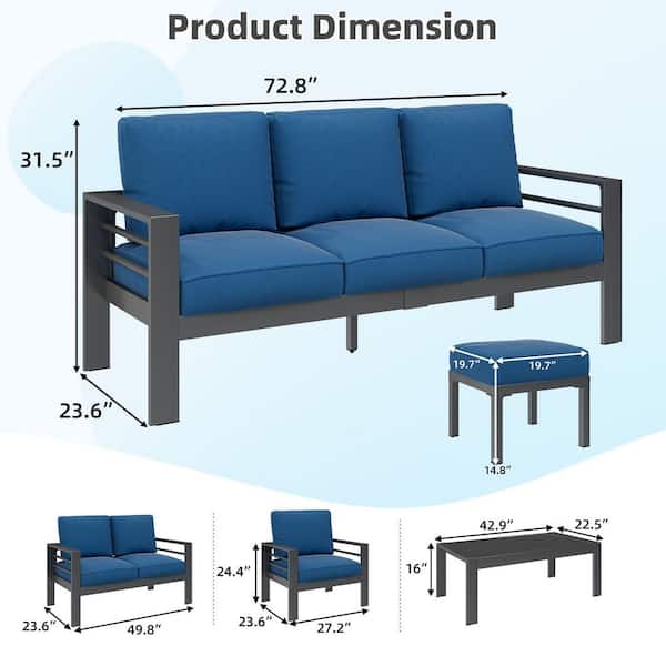 Gray 7-Piece Aluminum Patio Conversation Set with Ottomans and Blue Cushions