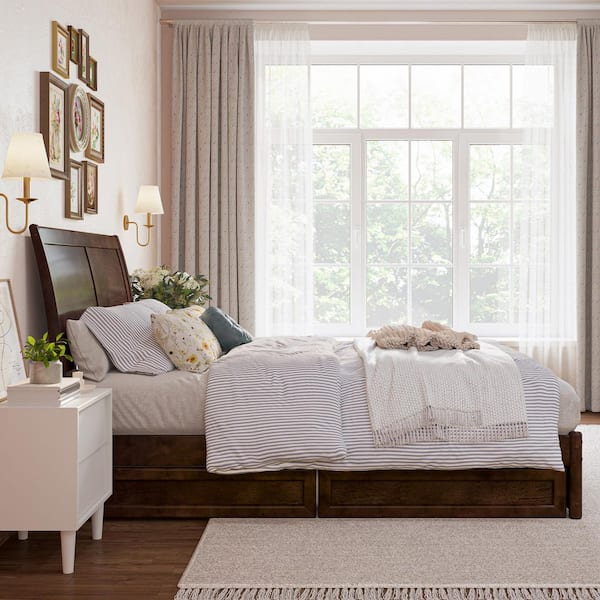Andorra Walnut Brown Solid Wood Frame Full Platform Bed with Panel Footboard and Storage-Drawers
