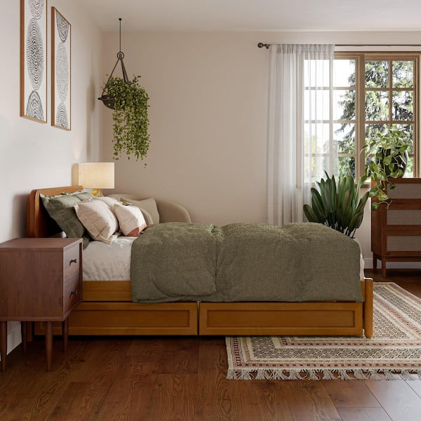 Capri Light Toffee Natural Bronze Solid Wood Frame Full Platform Bed with Panel Footboard and Storage Drawers