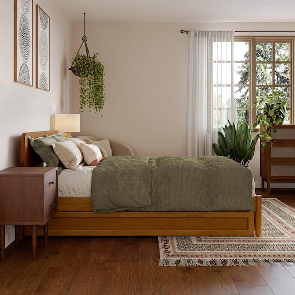 Capri Light Toffee Natural Bronze Solid Wood Frame Full Platform Bed with Panel Footboard and Twin Trundle