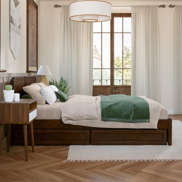 Capri Walnut Brown Solid Wood Frame Full Platform Bed with Panel Footboard and Storage Drawers