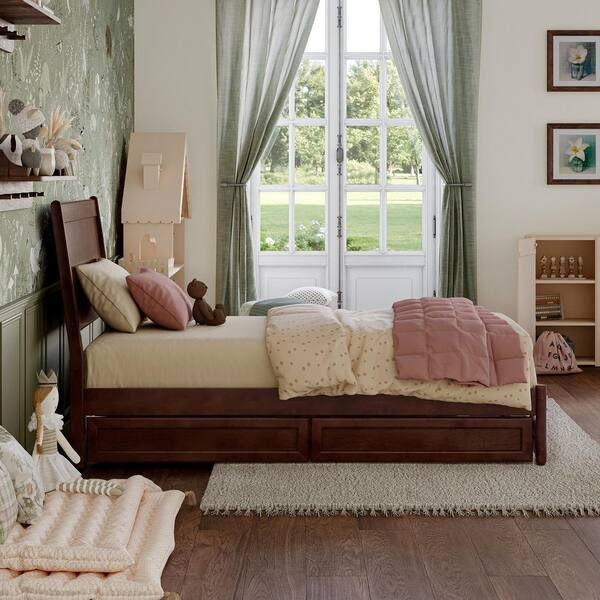 Casanova Walnut Brown Solid Wood Frame Twin Platform Bed with Panel Footboard and Storage Drawers