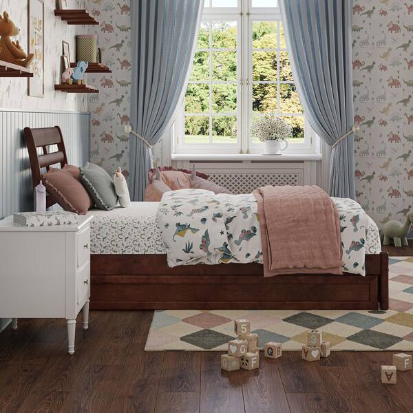 Emelie Walnut Brown Solid Wood Frame Twin Platform Bed with Panel Footboard and Twin Trundle