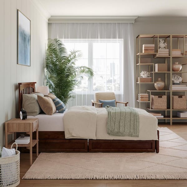 Everett Walnut Brown Solid Wood Frame Twin XL Platform Bed with Panel Footboard and Storage Drawers