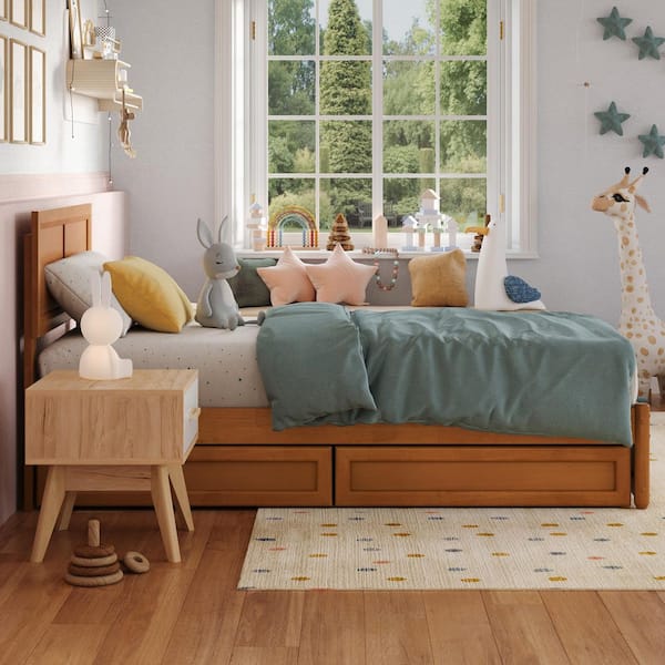 Lylah Light Toffee Natural Bronze Solid Wood Frame Twin Platform Bed with Panel Footboard and Storage Drawers