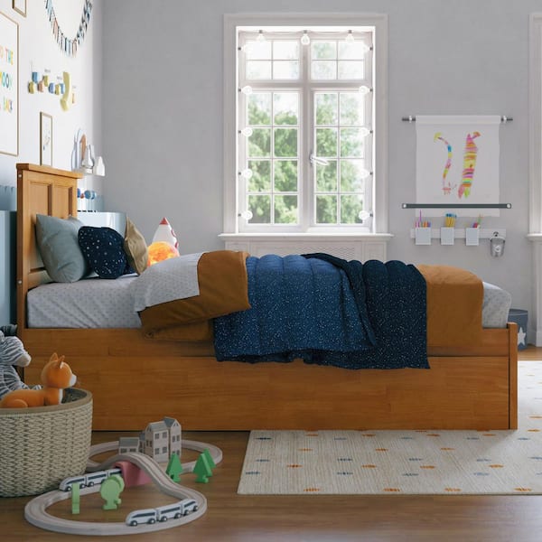 Madison Light Toffee Natural Bronze Solid Wood Frame Twin Platform Bed with Footboard and Twin Trundle