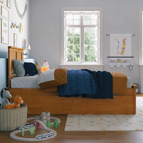 Madison Light Toffee Natural Bronze Solid Wood Frame Twin Platform Bed with Matching Footboard and Storage Drawers