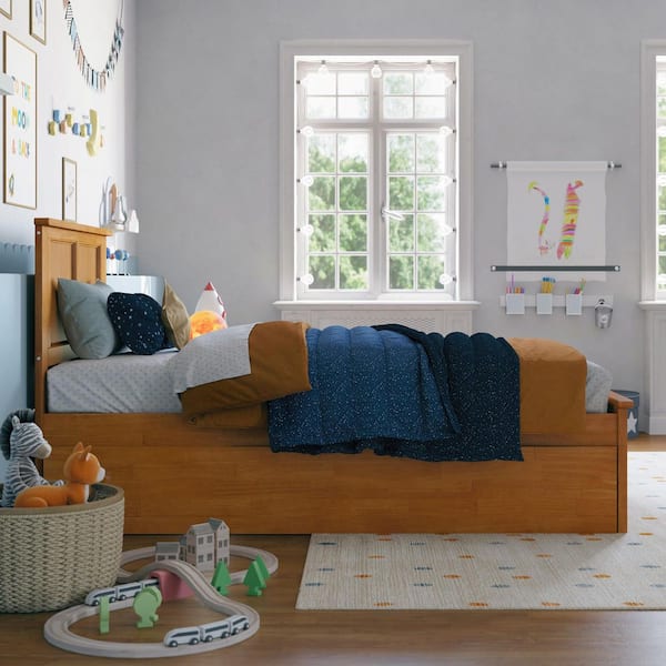 Madison Light Toffee Natural Bronze Solid Wood Frame Twin Platform Bed with Matching Footboard and Twin Trundle