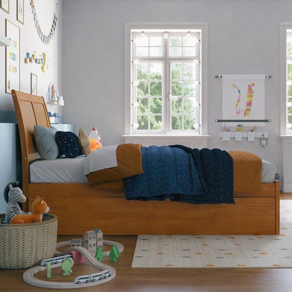 Portland Light Toffee Natural Bronze Solid Wood Frame Twin Platform Bed with Footboard and Twin Trundle