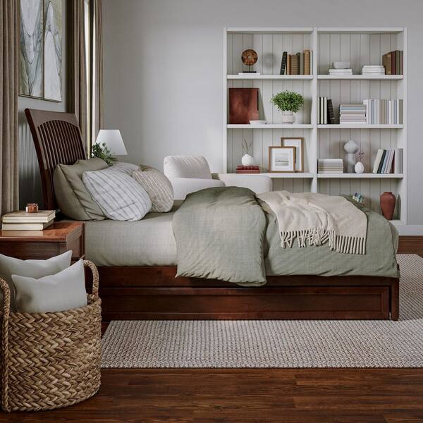 Roslyn Walnut Brown Solid Wood Frame Queen Platform Bed with Panel Footboard and Twin XL Trundle