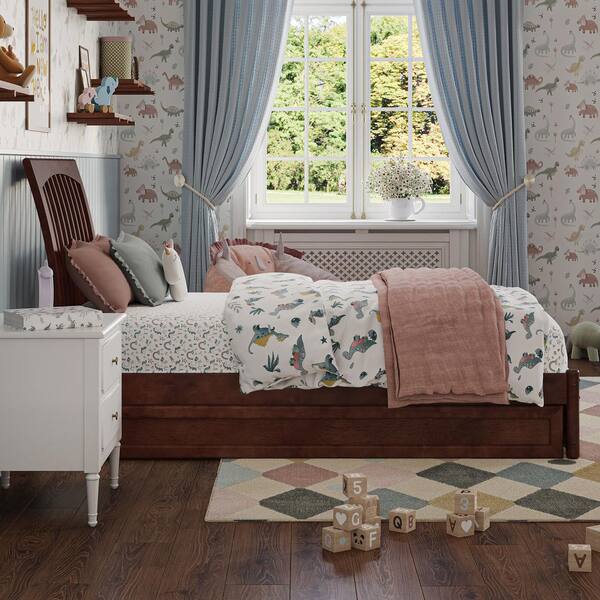 Roslyn Walnut Brown Solid Wood Frame Twin Platform Bed with Panel Footboard and Twin Trundle