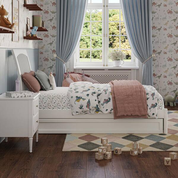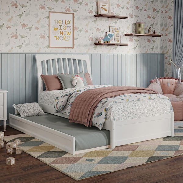 Roslyn White Solid Wood Frame Twin Platform Bed with Panel Footboard and Twin Trundle