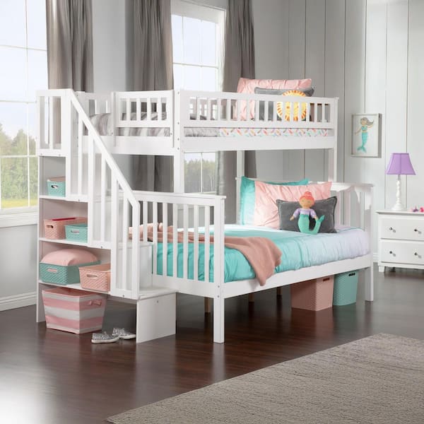 • Easy top bunk access stairs, high safety rails; solid hardwood