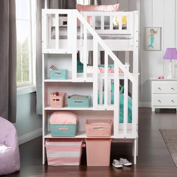 Woodland Staircase Bunk Bed Twin over Twin with Twin Size Raised Panel Trundle Bed in White