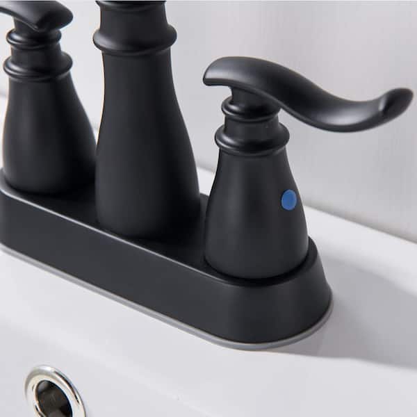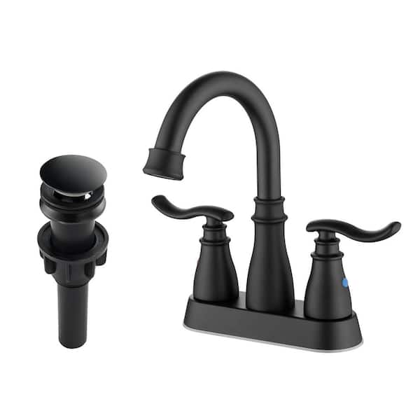 4 in. Centerset Double Handle High Arc Bathroom Faucet with Drain Assembly 3 Hole Bathroom Sink Taps in Matte Black
