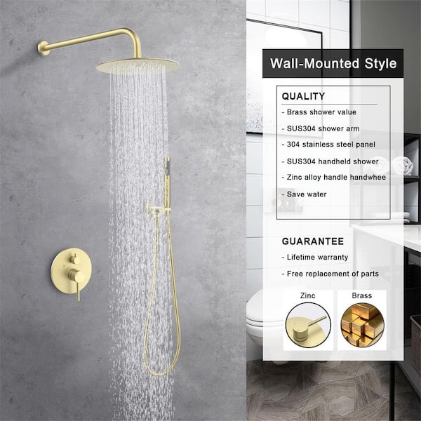 Single Handle 1-Spray Shower Faucet 1.8 GPM with Pressure Balance 10 Inch Brass Wall Mount Shower System in Brushed Gold