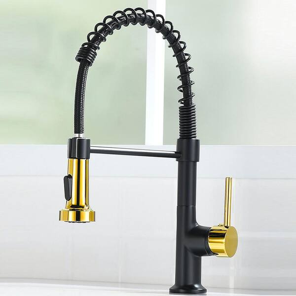 Single Handle Pull Down Sprayer Kitchen Faucet with Advanced Spray Spring Brass Kitchen Tap in Matte Black&Polished Gold