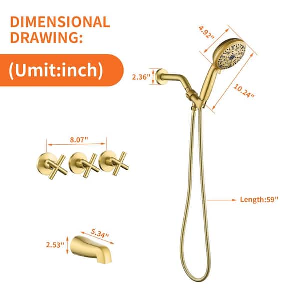 Triple Handle 10-Spray Wall Mount Tub and Shower Faucet 1.8 GPM Brass Shower System in Brushed Gold Valve Included