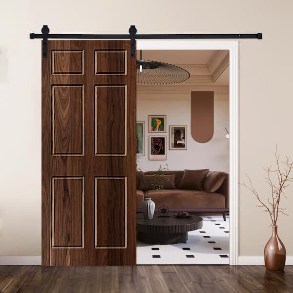 6-Panel Designed 84 in. x 32 in. Wood Panel Dark Walnut Painted Sliding Barn Door with Hardware Kit