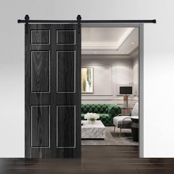 6-Panel Designed 84 in. x 36 in. Wood Panel Ebony Painted Sliding Barn Door with Hardware Kit