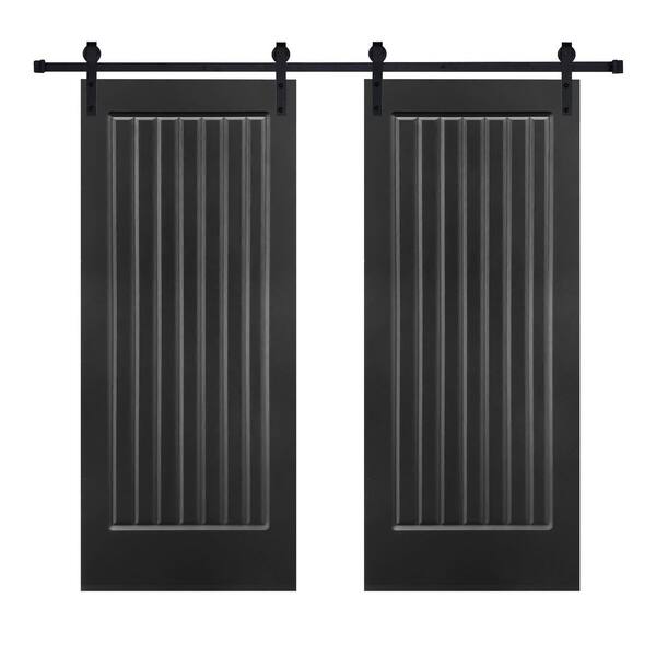 Double Modern Five Panel 42 in. x 96 in. MDF Black Barn Sliding Door With Hardware kit