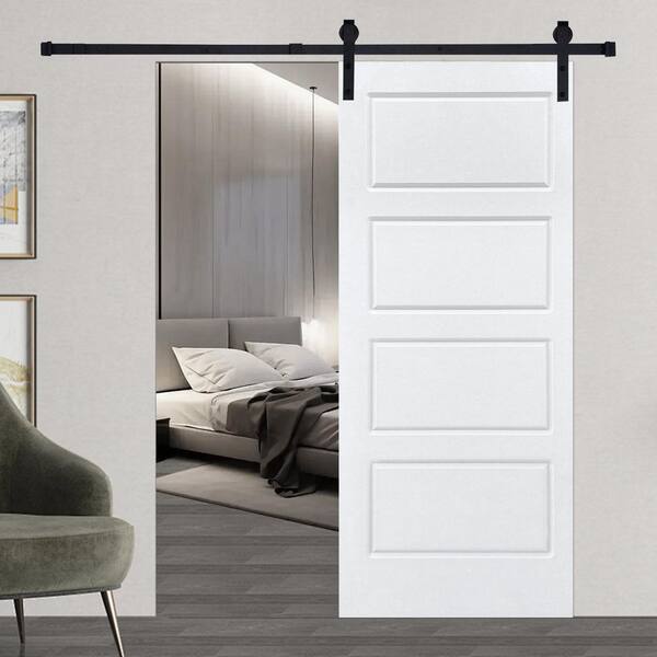 Modern 4 Panel 28 in. x 84 in. MDF White Sliding Barn Door with Hardware Kit