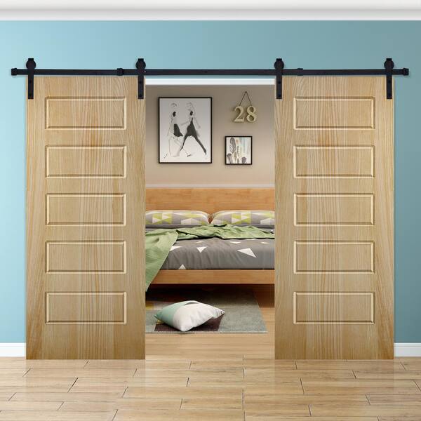 Modern 5 Panel Designed 60 in. x 80 in. Wood Panel Mother Nature Painted Double Sliding Barn Door with Hardware Kit