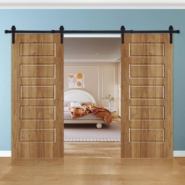 Modern 5 Panel Designed 64 in. x 80 in. Wood Panel Brair Smoke Painted Double Sliding Barn Door with Hardware Kit