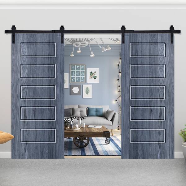 Modern 5 Panel Designed 72 in. x 84 in. Wood Panel Icy Gray Painted Double Sliding Barn Door with Hardware Kit