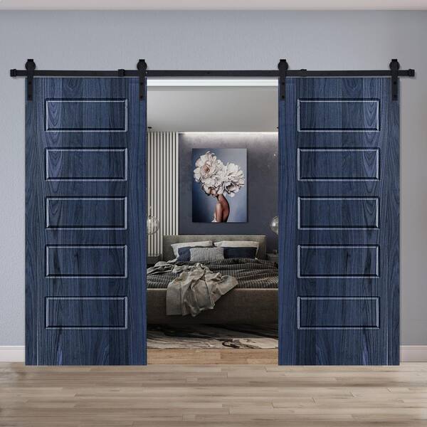 Modern 5 Panel Designed 84 in. x 80 in. Wood Panel Royal Navy Painted Double Sliding Barn Door with Hardware Kit
