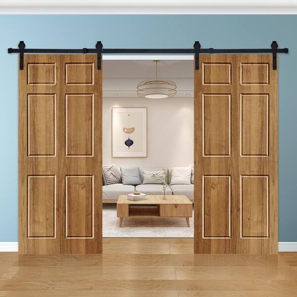 Modern 6 Panel Designed 48 in. x 80 in. Wood Panel Brair Smoke Painted Double Sliding Barn Door with Hardware Kit