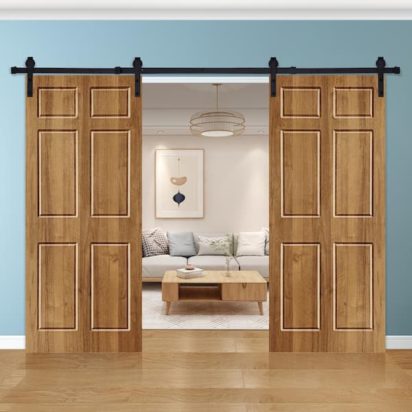 Modern 6 Panel Designed 56 in. x 84 in. Wood Panel Brair Smoke Painted Double Sliding Barn Door with Hardware Kit