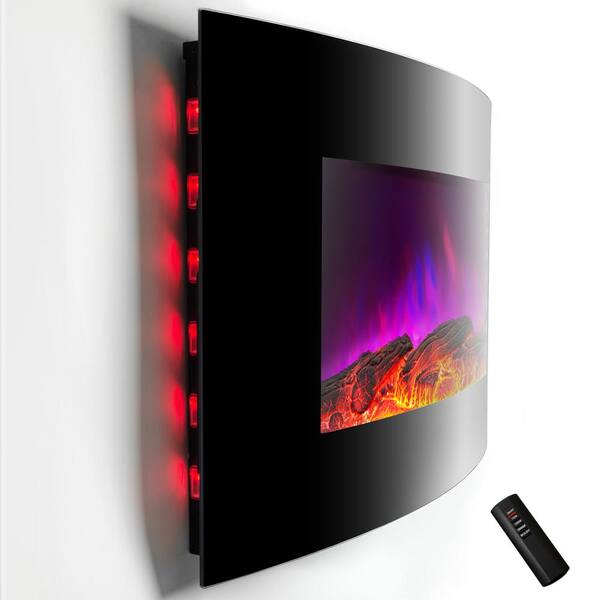36 in. Wall Mount Electric Fireplace Heater in Black with Curved Tempered Glass, Pebbles, Logs and Remote Control