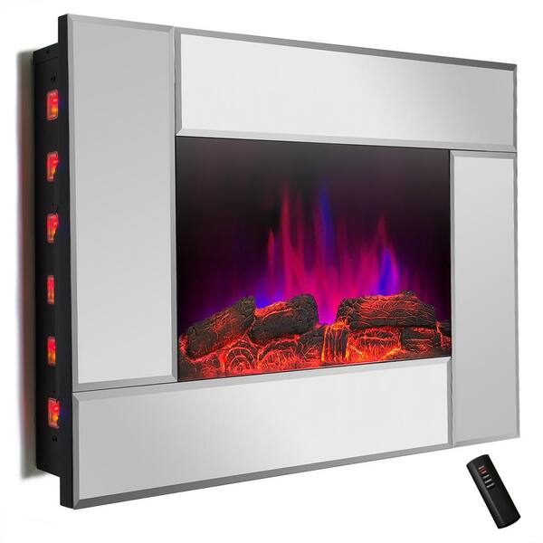 36 in. Wall Mount Electric Fireplace Heater in Mirror with Tempered Glass, Pebbles, Logs and Remote Control
