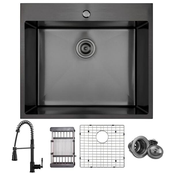 All-in-One Matte Black Finished Stainless Steel 25 in. x 22 in. Drop-In Single Bowl Kitchen Sink with Spring Neck Faucet