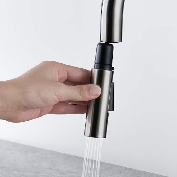 Easy-Install Single-Handle Deck Mount Squared Arc Pull-Down Sprayer Kitchen Faucet with Flexible Hose in Brushed Nickel
