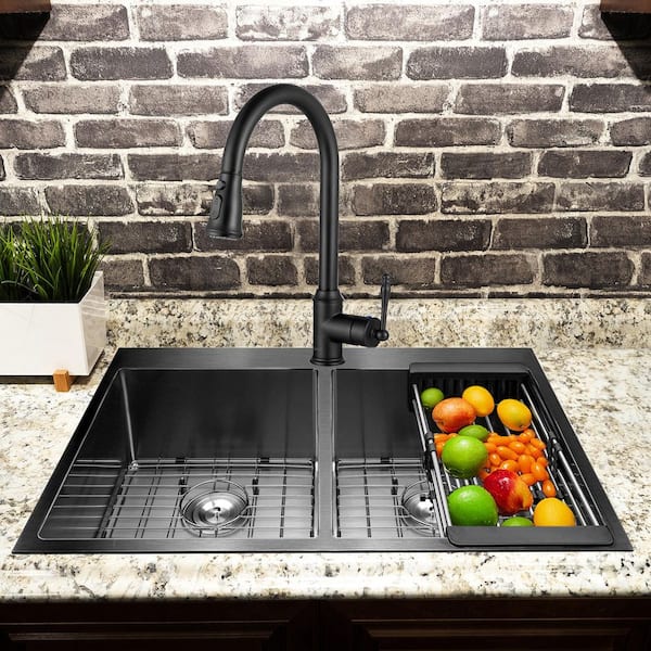 Gunmetal Matte Black Finish Stainless Steel 33 in. x 22 in. Double Bowl Drop-In Kitchen Sink with Bottom Grid