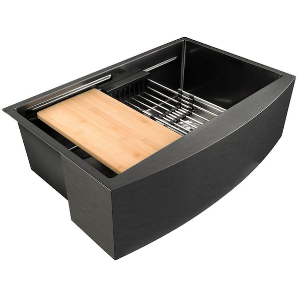 HEX 33 in. Farmhouse Apron Front Single Bowl Gunmetal Black Stainless Steel Workstation Kitchen Sink with Cutting Board