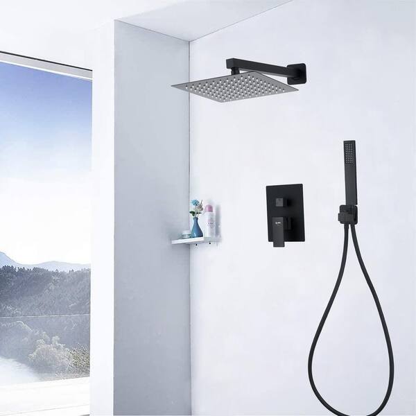 Square, wall-mounted fixed rain shower faucet, handheld shower combo, in Matte Black.