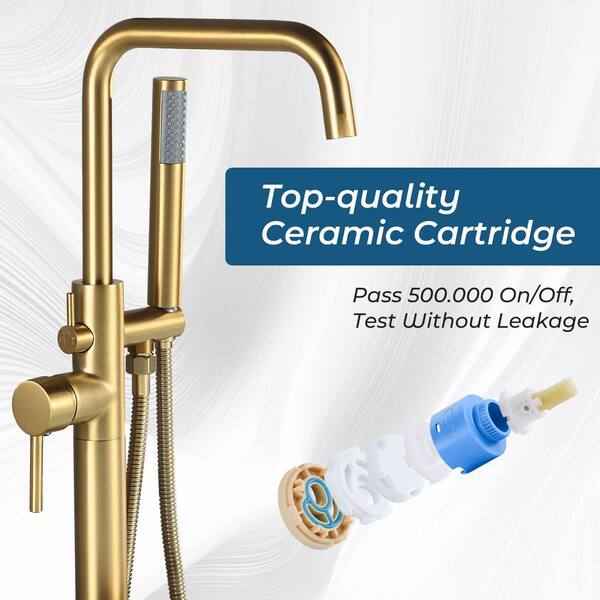 1-Handle Floor Mount Freestanding Tub Faucet Bathtub Filler with Hand Shower in Brushed Gold