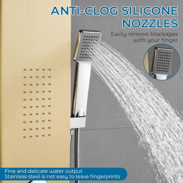 4-Jet Rainfall Shower Panel System with Rainfall Waterfall Shower Head and Shower Wand in Brushed Gold