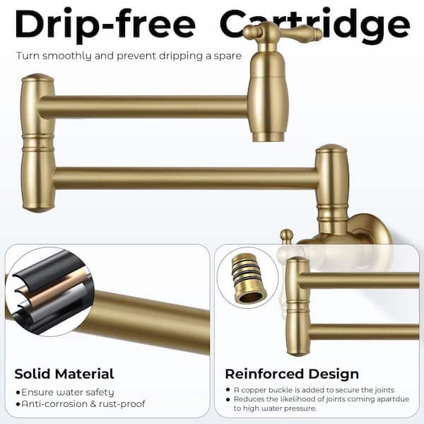 Commercial Restaurant 2 Handle Wall Mount Pot Filler with Retractable Arm in Brushed Gold