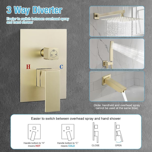 Single Handle 3-Spray Tub and Shower Faucet with 12 in. Rain Shower Heads 1.8 GPM in Brushed Gold (Valve Included)