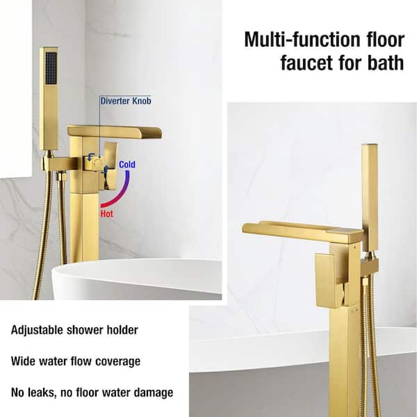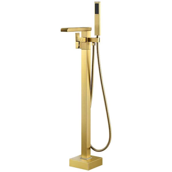 Single-Handle Claw Foot Tub Faucet Freestanding Floor Mount Roman Tub Faucet with Hand Shower in Brushed Gold