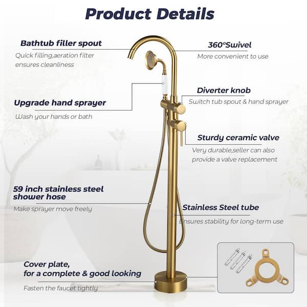 Single-Handle Floor-Mount Roman Tub Faucet with Hand Shower in Brushed Gold